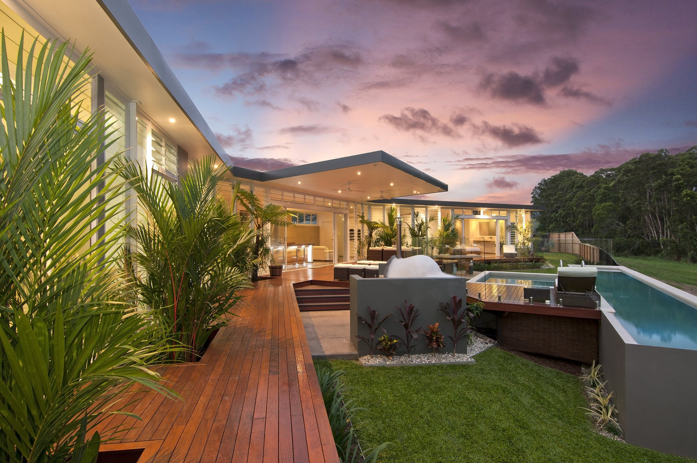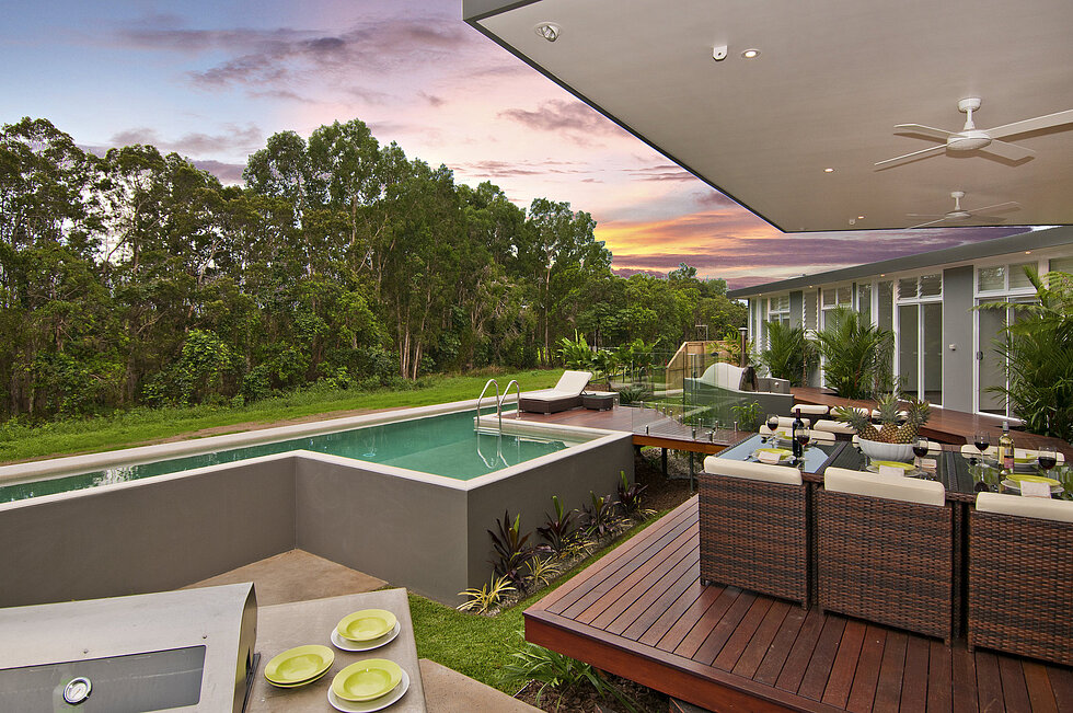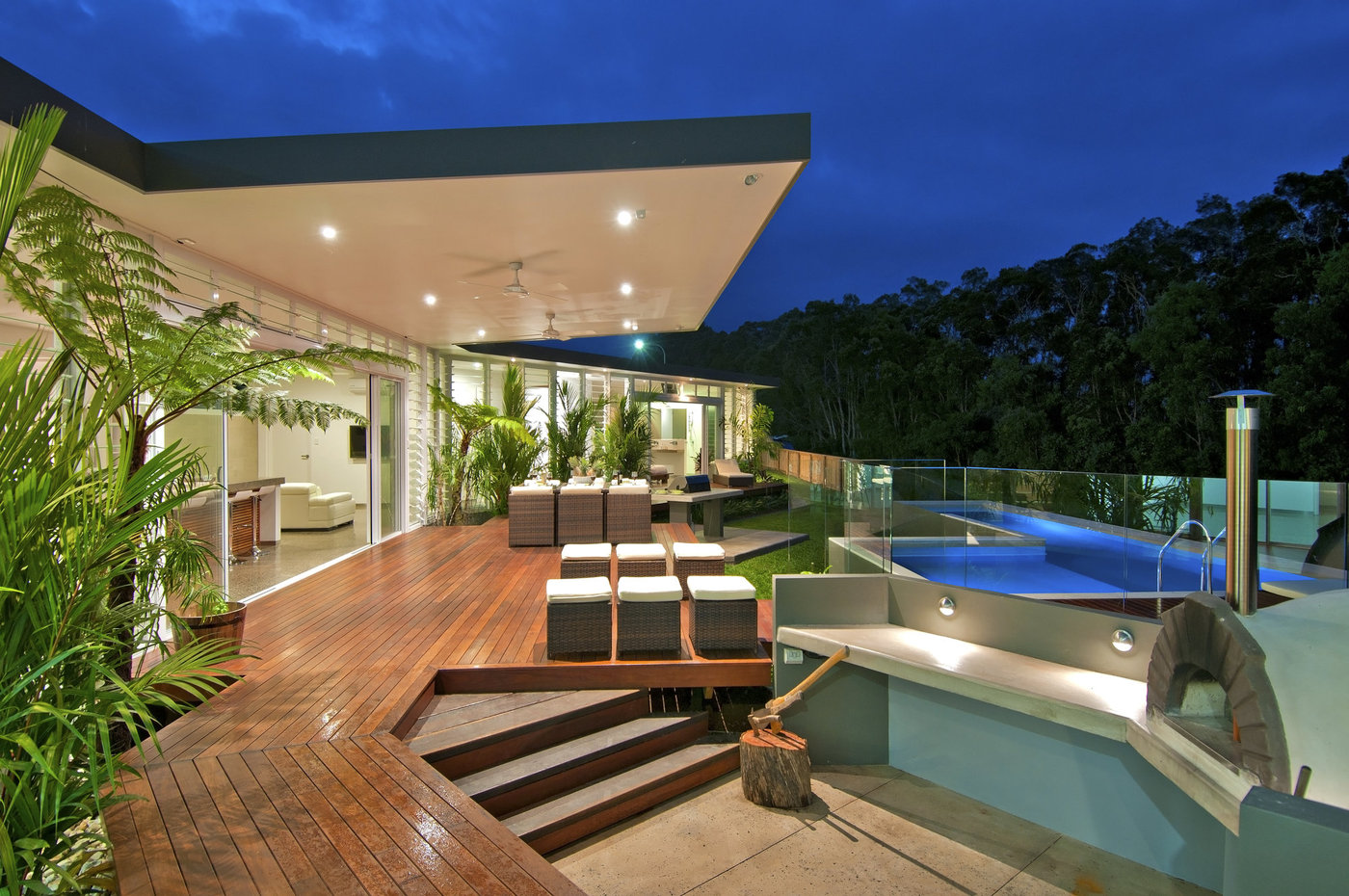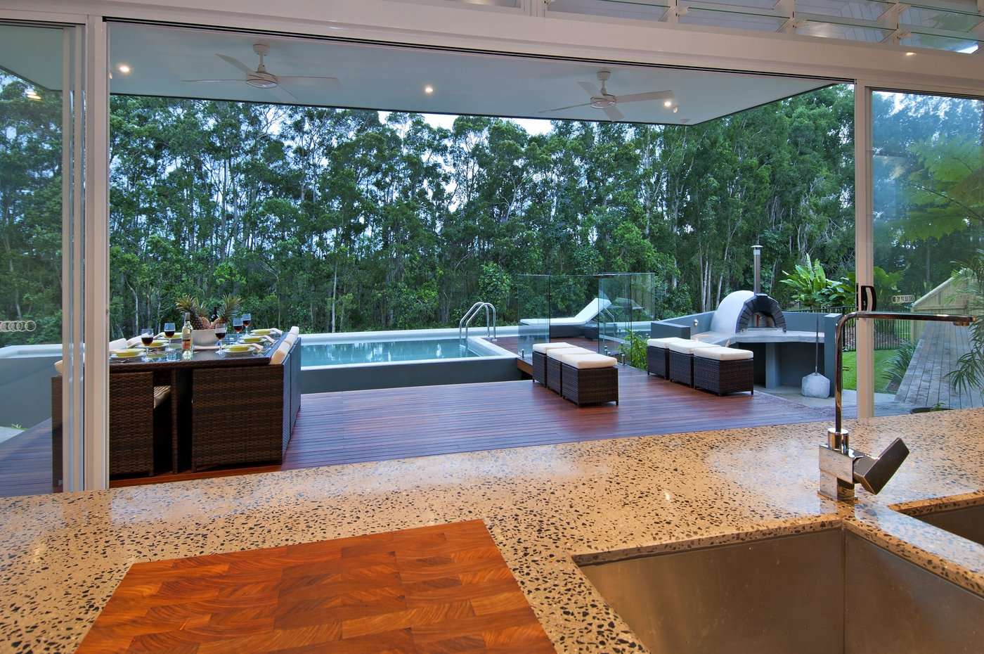 The multi-award winning home is all about open-plan living and outdoor entertaining.  All aspects of the home take advantage of the stunning green backdrop and enormous lap pool. The large four bedrooms have their own private deck, adjoining the main entertainment and swimming pool area. A custom-built pizza oven and stainless steel teppanyaki BBQ creates an entertainer’s paradise. The huge outdoor living area is protected by an even larger cantilevered roofing structure that leaves one questioning how it was possible?
