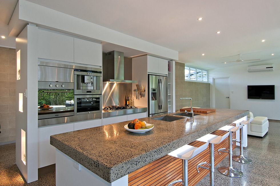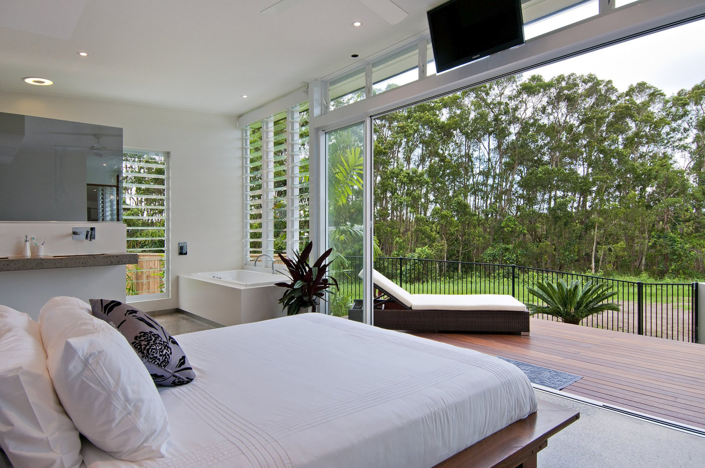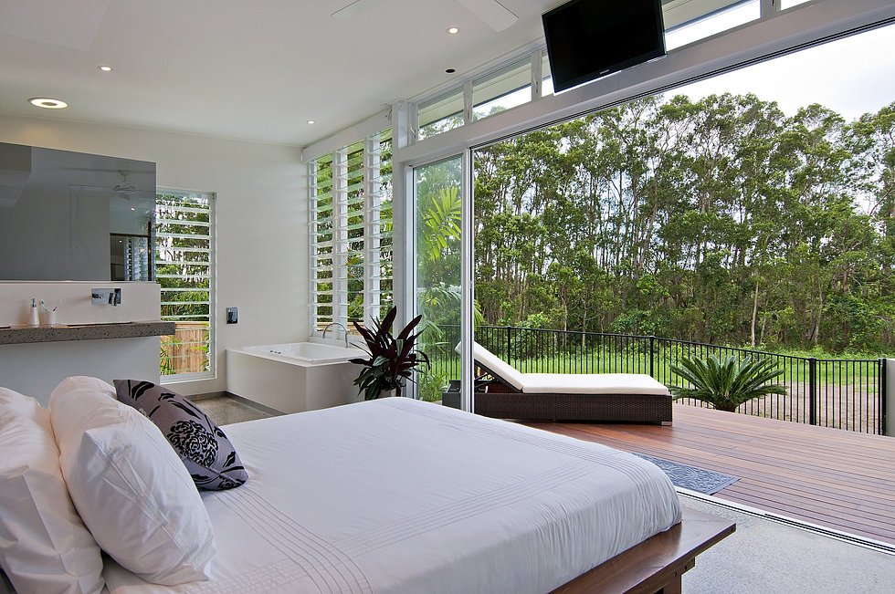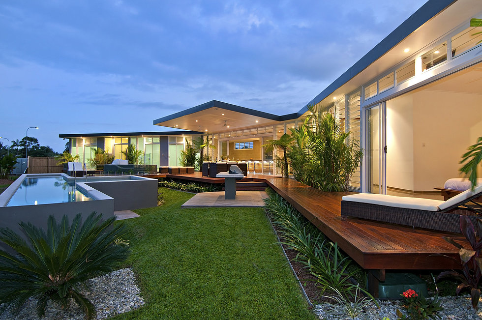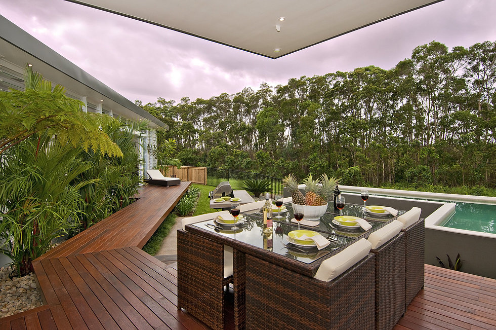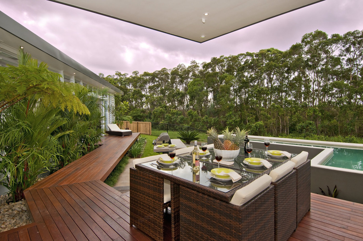 The multi-award winning home is all about open-plan living and outdoor entertaining.  All aspects of the home take advantage of the stunning green backdrop and enormous lap pool. The large four bedrooms have their own private deck, adjoining the main entertainment and swimming pool area. A custom-built pizza oven and stainless steel teppanyaki BBQ creates an entertainer’s paradise. The huge outdoor living area is protected by an even larger cantilevered roofing structure that leaves one questioning how it was possible?