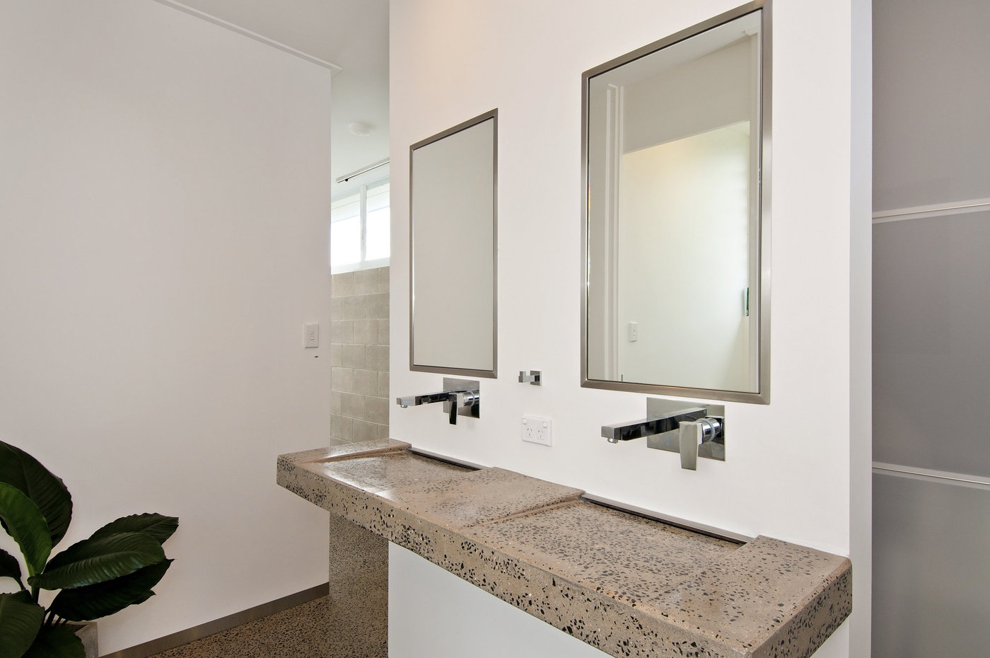 Stunning hand-formed concrete vanity bowls and benchtops with seamless waste troughs are a testament to the diligence of design and craftsmanship by the team whom meticulously created them.