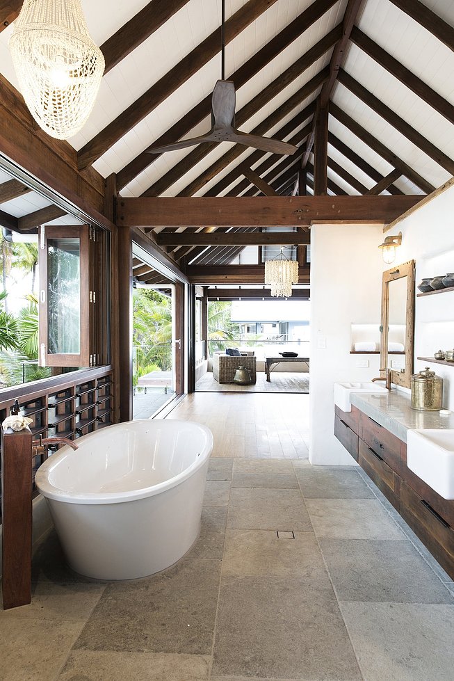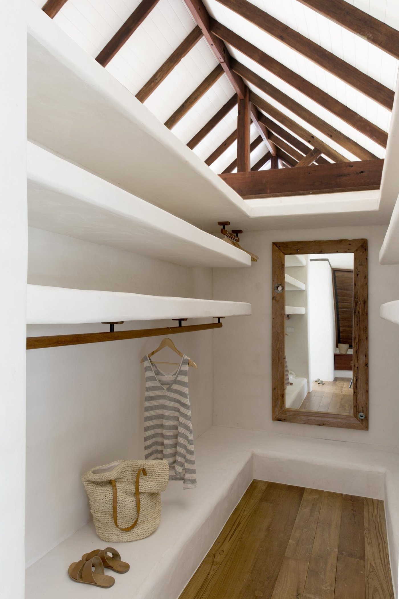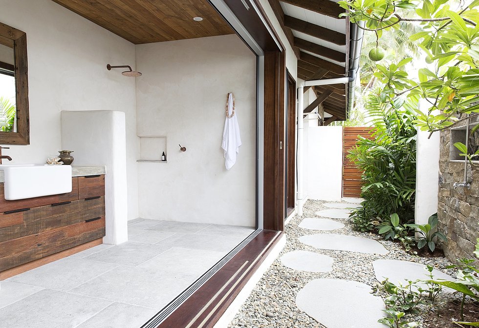 A raw, custom blend of solid undulated white, cement based render is featured extensively throughout the home, used on the ceiling, concrete formed robe shelving, and internal and external walls adding to the rustic, aged appearance of the home whilst also allowing the home blend harmoniously with its tropical beach surroundings.