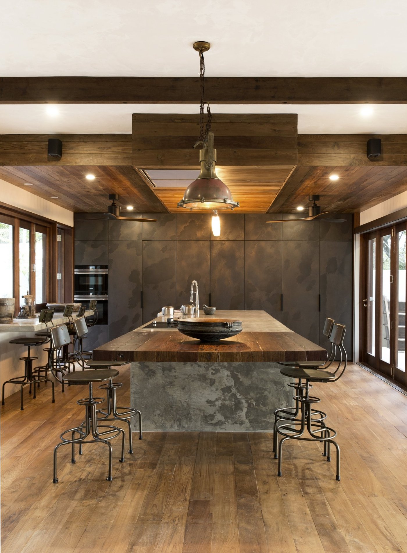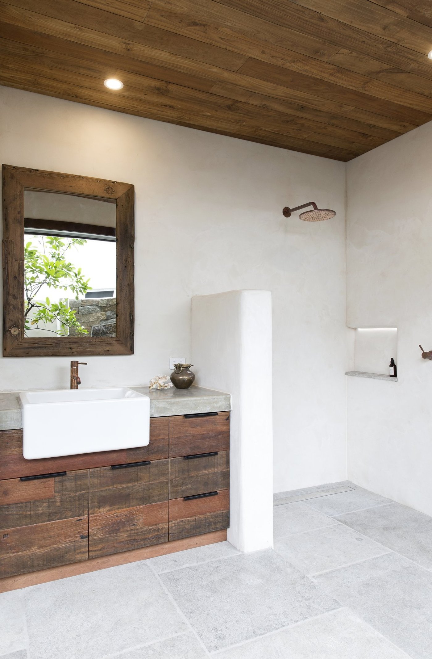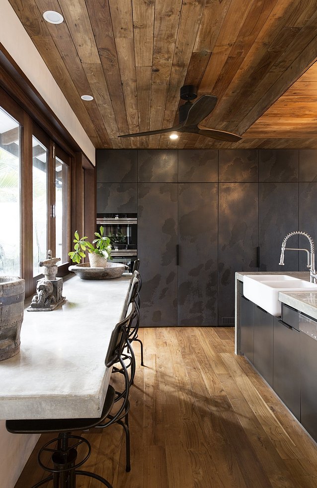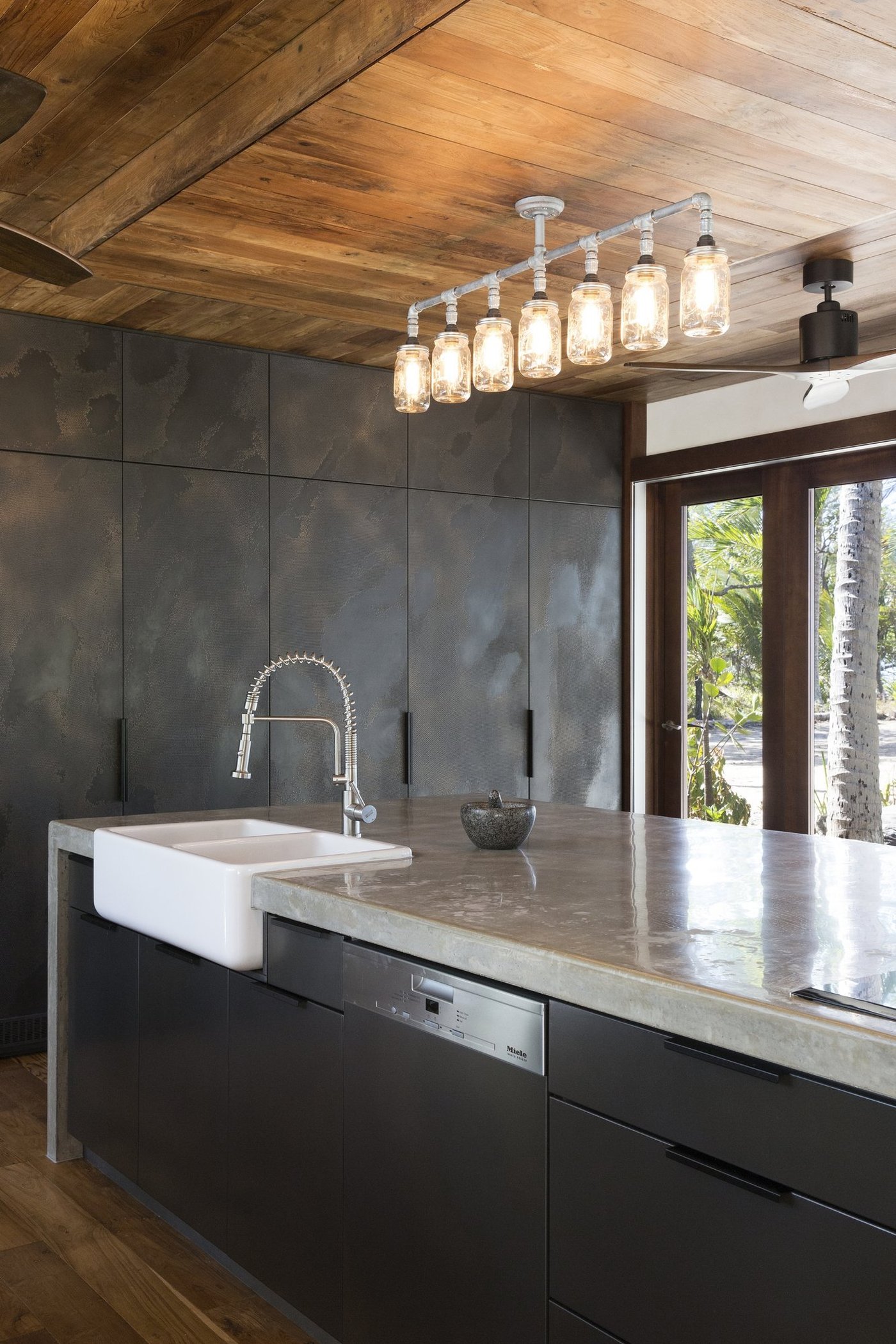 Setting the tone for the home beyond, hand carved timber entry doors imported from India, set into a dry stack rock wall, lead visitors through an external corridor of recycled timber frames, handcrafted by a local joiner to meet category 3 cyclone requirements. In the kitchen, cabinetry in an aged metal finish - custom made by Axolotl, combines with hand formed burnished concrete and a myriad of recycled timbers to create a warm and inviting ambience.