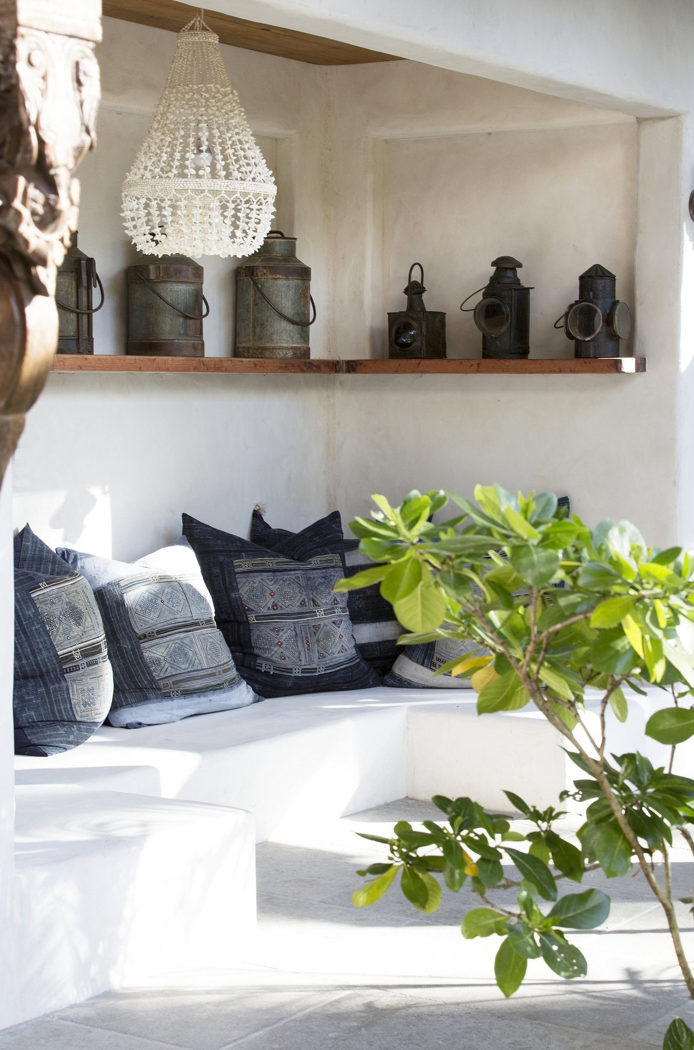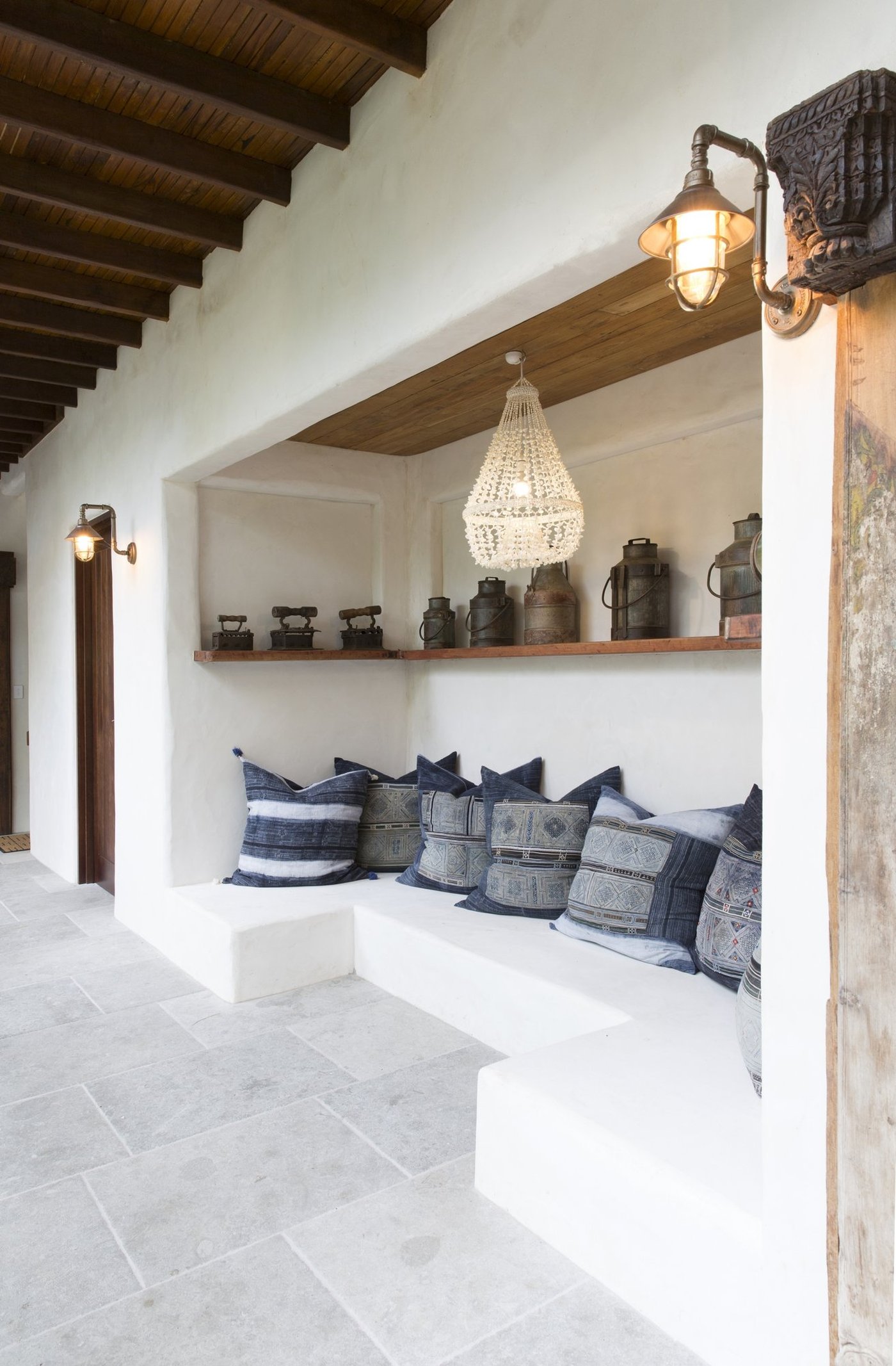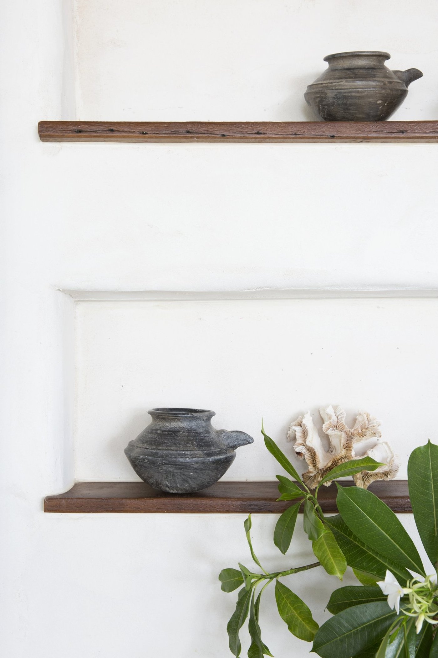 Setting the tone for the home beyond, hand carved timber entry doors imported from India, set into a dry stack rock wall, lead visitors through an external corridor of recycled timber frames, handcrafted by a local joiner to meet category 3 cyclone requirements. In the kitchen, cabinetry in an aged metal finish - custom made by Axolotl, combines with hand formed burnished concrete and a myriad of recycled timbers to create a warm and inviting ambience.