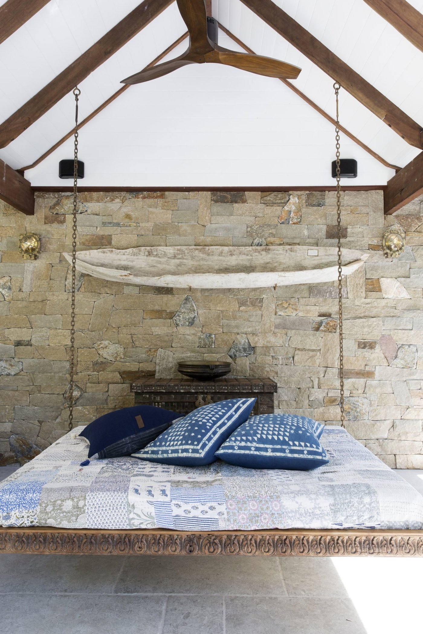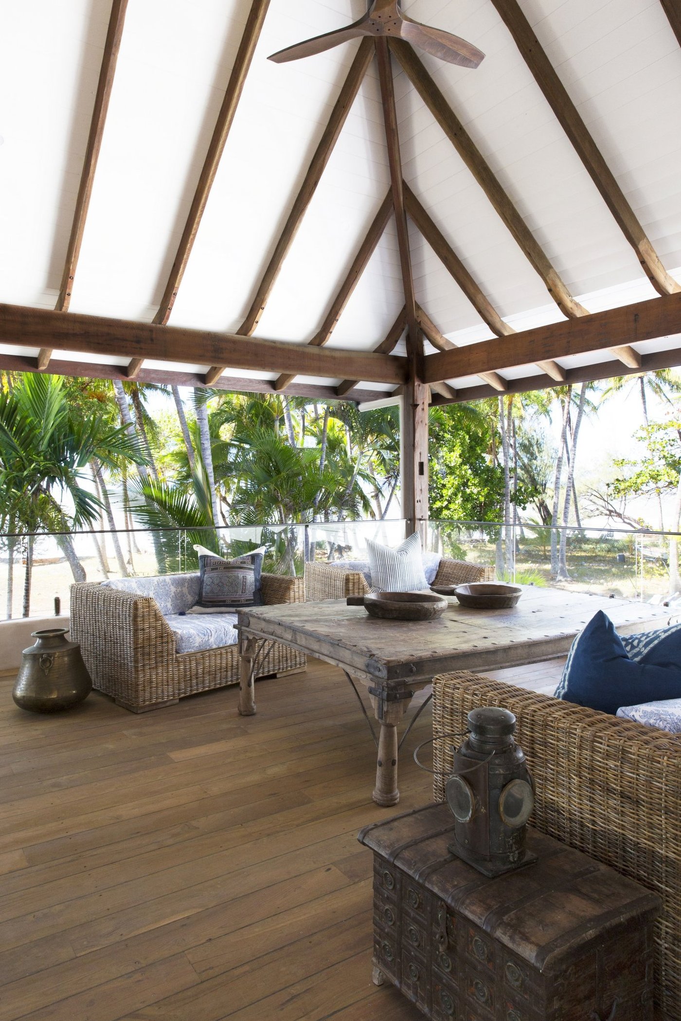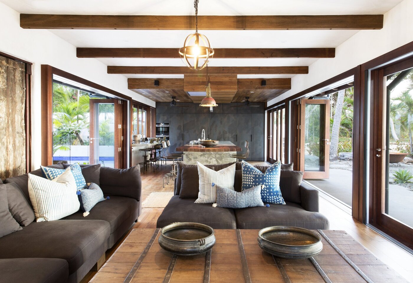 Recycled teak flooring, imported from India by the client was instructed to be laid as if it was in an old temple and a hand-pitched ceiling also features recycled timber beams. Timber framed stacking doors allow the home to be fully opened up to enjoy the stunning coastal location.